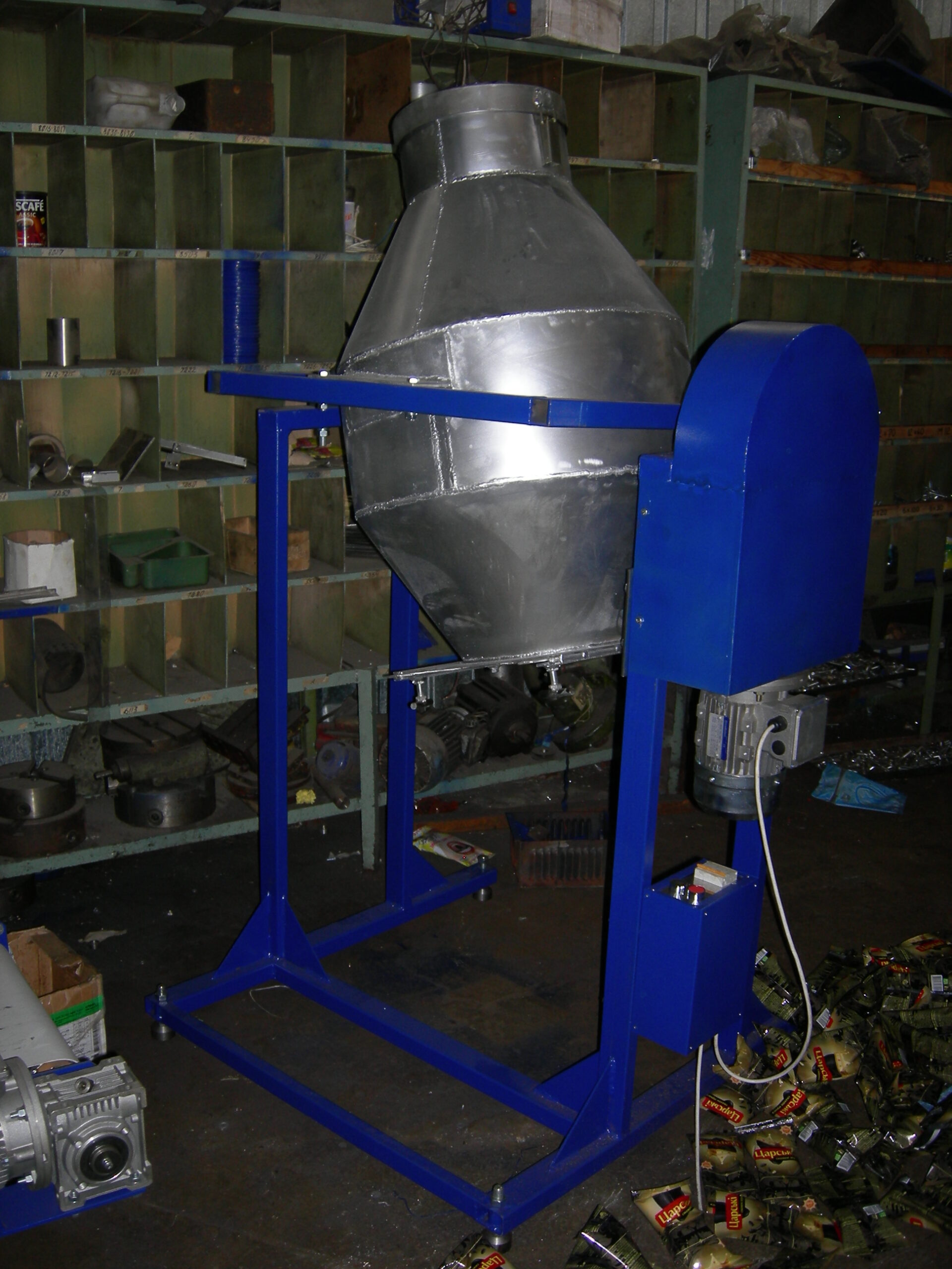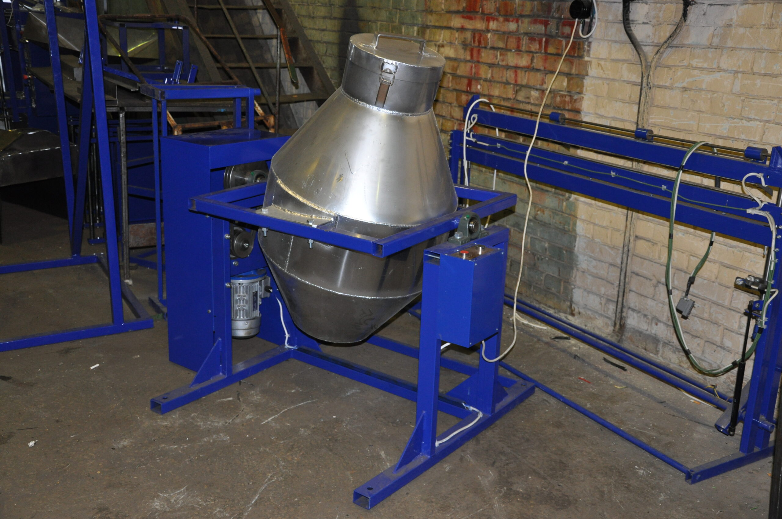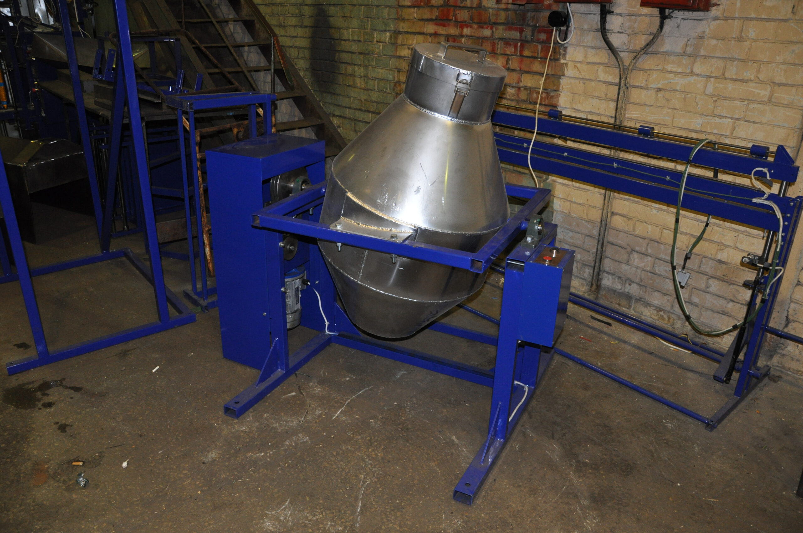 Дане обладнання є оптимальним для змішування різної продукції, за рахунок, траєкторії руху суміші всередині ємності (бочки), що досягається, за допомогою розрахованого кута кріплення ємності (бочки) до валу обертання. Це дозволяє позбутися лопатей і лопаток всередині ємності (бочки), тим самим виключаючи місця скупчення продукту.